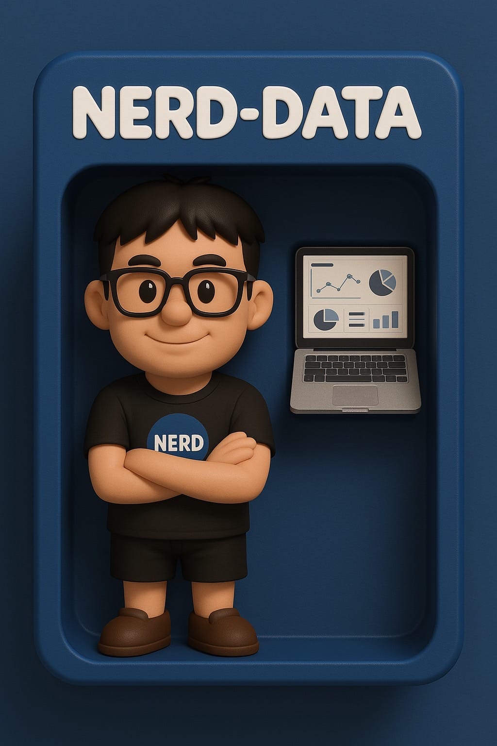 สร้างโมเดลการ์ตูน Art Toy 3D ใช้คนในภาพนี้ โดยตัวโมเดลอยู่ด้านซ้าย และด้านขวามี Accessories {MacBook Dashboard} โดยให้อยู่ใน Packaging กล่อง {สีน้ำเงินเข้ม} และมีคำว่า {Nerd-Data} อยู่ด้านบนเป็นชื่อโมเดล ใส่เสื้อคอกลมสีดำมีโลโก้ Nerd ตัวอักษรสีขาวบนวงกลมสีน้ำเงินตามภาพ