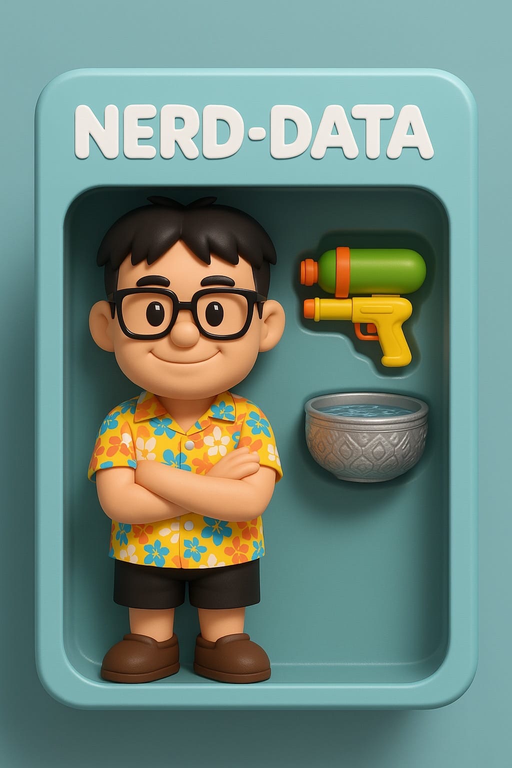 สร้างโมเดลการ์ตูน Art Toy 3D ใช้คนในภาพนี้ โดยตัวโมเดลอยู่ด้านซ้าย และด้านขวามี Accessories {ปืนฉีดน้ำ ขันน้ำสงกรานต์} โดยให้อยู่ใน Packaging กล่อง {สีฟ้า} และมีคำว่า {Nerd-Data} อยู่ด้านบนเป็นชื่อโมเดล ใส่เสื้อลายดอกเทศกาลสงกรานต์