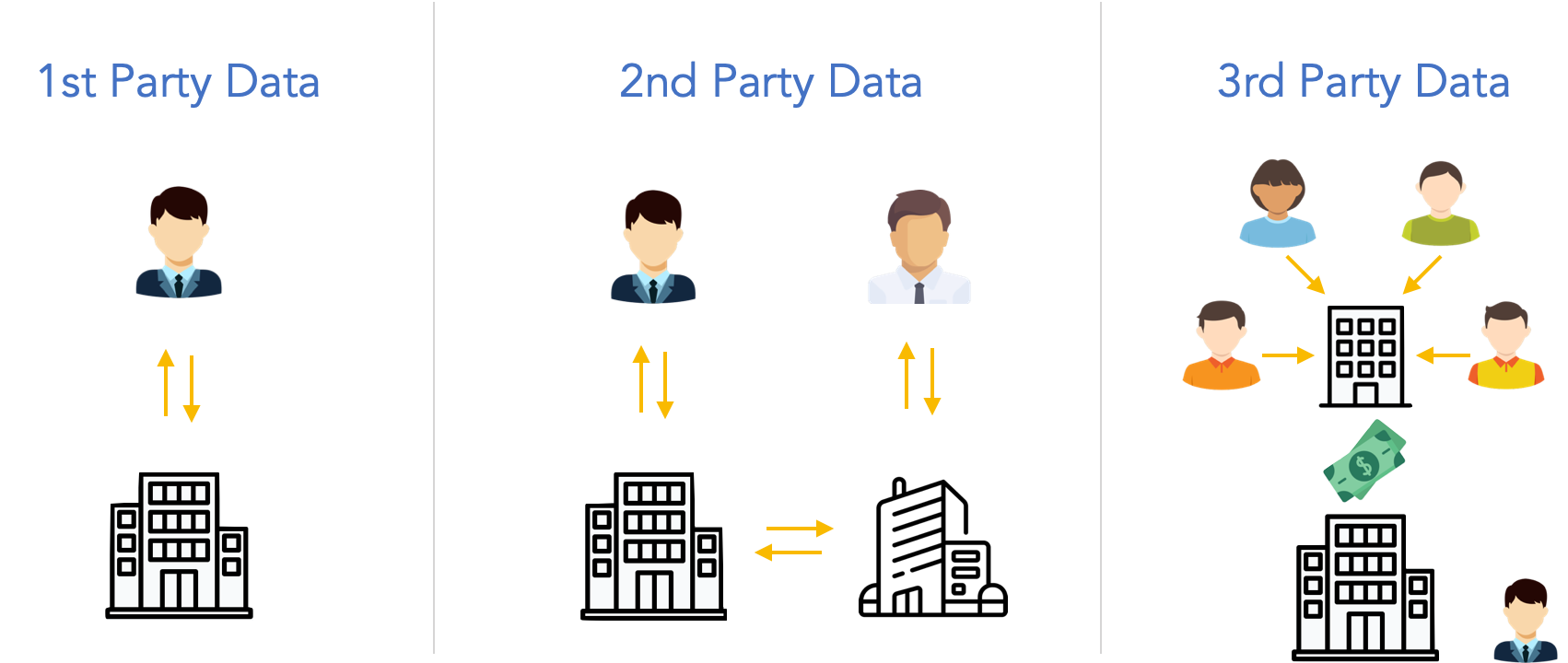 - First-party data เป็นข้อมูลซึ่งองค์กรของเราเก็บรวบรวมจากผู้บริโภคโดยตรง ข้อด้อย คือ บางธุรกิจอาจขาดมิติความหลากหลายของข้อมูล