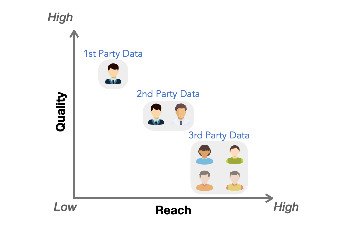 แม้ว่าจะมีกรณีการใช้งานสำหรับข้อมูลจาก Second-party และ Third-party แต่ข้อมูลจาก First-party (ข้อมูลที่เรารวบรวมเอง) มีคุณค่ามากกว่า เนื่องจากเป็นข้อมูลเกี่ยวกับพฤติกรรม ความคิด และ ความรู้สึกของผู้บริโภค ซึ่งมาจากแหล่งที่เชื่อถือได้