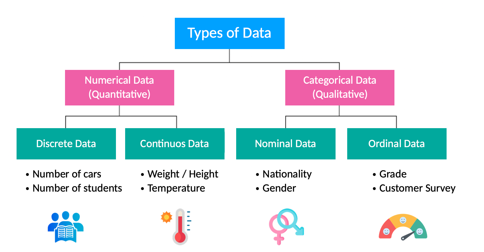 ข้อมูลอาจเป็นข้อมูล Numerical Data (Quantitative) และ Categorical Data (Qualitative) วิธีการรวบรวมข้อมูลหลายวิธีใช้ได้กับข้อมูลทั้งสองประเภท แต่บางวิธีก็เหมาะกับวิธีใดวิธีหนึ่งมากกว่า