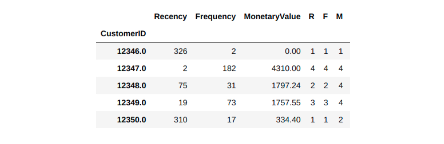 - ทำการให้คะแนน โดยแบ่งเป็น 4 กลุ่ม R, F, M โดย R ที่มีค่าน้อยจะได้คะแนนสูง (เพิ่งซื้อไม่นาน)